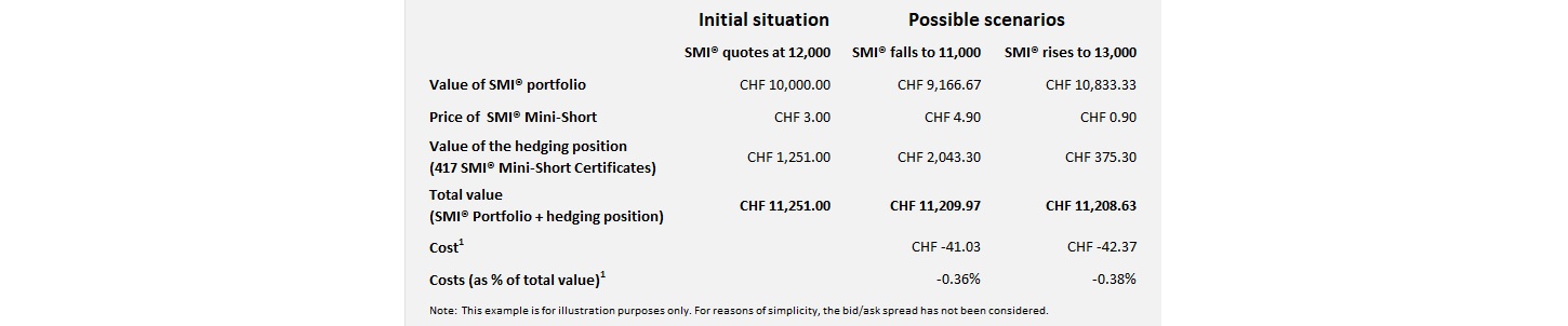 The following example shows how a portfolio of Swiss equities valued at CHF 10,000 can be hedged against falling prices. An analysis of the portfolio’s stocks indicates that it should track the Swiss Market Index (SMI®) closely, so the portfolio can be hedged with SMI® Mini-Futures or SMI® Knock-Out Warrants. However, hedging can only be performed approximately, because it entails costs and the correlation between the portfolio and the index is rarely 100 % in practice.