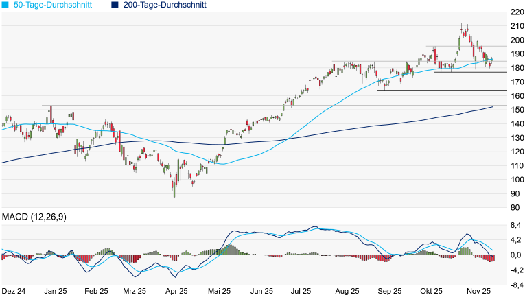 186,37 Dollar verlaufenden 50-Tage-Linie aus dem Handel ging. Damit hat sich weiteres Kurspotenzial bis zum Zwischenhoch vom 10. Oktober bei 195,62 Dollar eröffnet. In etwa auf diesem Niveau notierte die Aktie gestern im ausserbörslichen Handel. Kann die Hürde heute gemeistert werden, wäre der Weg in Richtung Rekordhoch wieder unverbaut. Die Gefahr eines weiteren Absturzes scheint vorerst gebannt zu sein. Ungemach hätte gedroht, wenn das Zwischentief vom 22. Oktober bei 176,76 Dollar