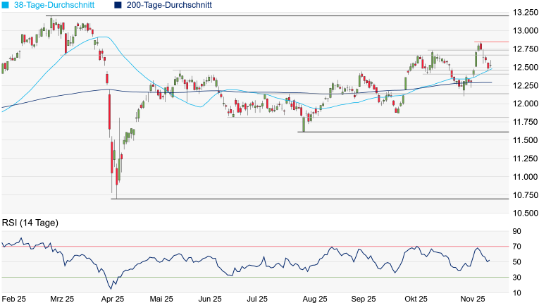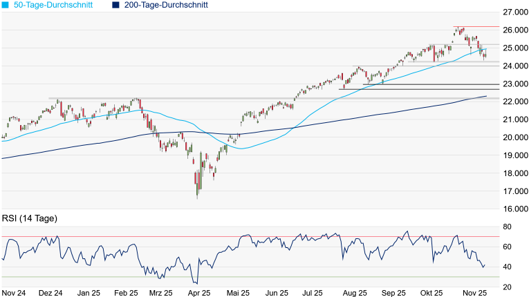 ungewiss. Gestern wies die US-Regierung bereits darauf hin, dass der Jobreport für Oktober zusammen mit dem Bericht für November am 16. Dezember veröffentlicht wird, was der Markt erstaunlich gut wegsteckte. Sollte die Stimmung doch kippen, würde Ungemach auf der Unterseite erst bei einem Unterschreiten des August-Hochs bei 23.969 Punkten drohen.