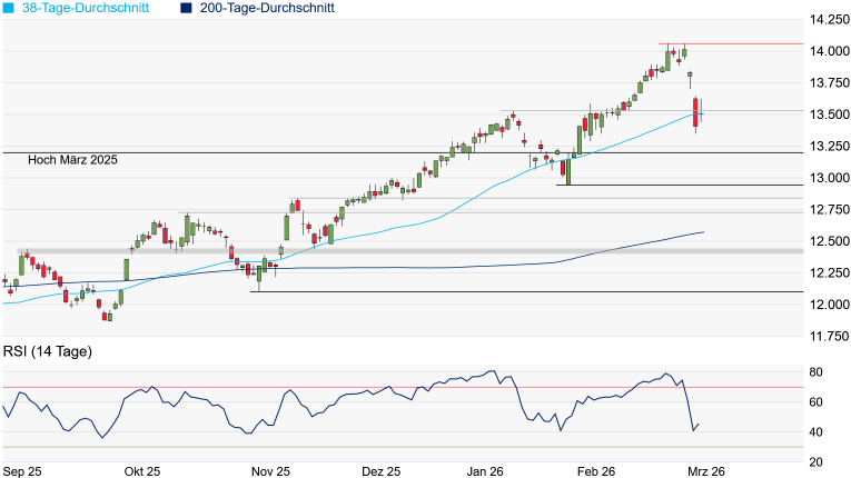 zumindest der Weg in Richtung Rekordhoch bei 14.063,53 Punkten wieder nahezu unverbaut. Allerdings könnte die Stimmung an den Märkten jederzeit wieder kippen. Sackt der SMI hingegen erneut unter die 38-Tage-Linie, wäre zunächst wieder Platz bis zum Hoch vom März 2025 bei 13.199 Punkten. Das Chartbild würde sich jedoch erst etwas gravierender eintrüben, wenn auch das Januar-Tief bei 12.942 Punkten unterschritten wird.