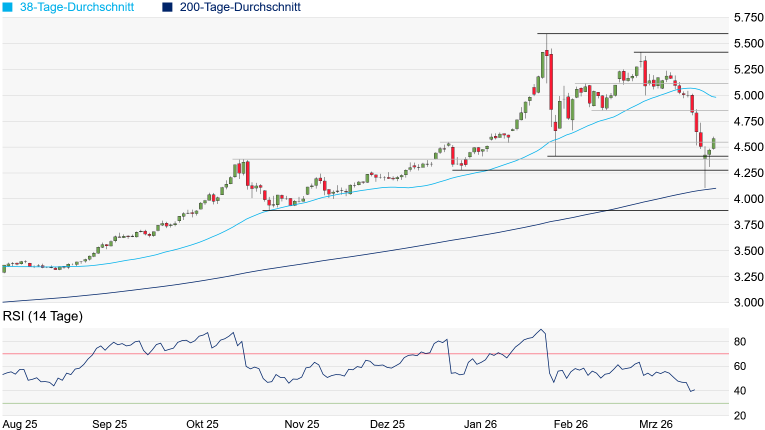 18 Prozent abwärts. Es dürfte kein Zufall gewesen sein, dass der Goldpreis unmittelbar vor Erreichen des aktuell bei 4.103 Dollar verlaufenden 200-Tage-Durchschnitts seine Richtung geändert hat. Positiv zu werten ist auch, dass die Tiefpunkte vom Februar bei 4.411 Dollar und vom 31. Dezember bei 4.280 Dollar zwar unterschritten wurden, auf Schlusskursbasis jedoch verteidigt werden konnten. Somit könnte der Goldpreis seinen Spielraum auf der Unterseite bereits ausgelotet haben. In den frühen