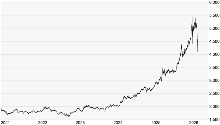 Die Edelmetallpreise sind weiter ausser Rand und Band. Galt vor allem Gold in unsicheren Zeiten bisher als sicherer Hafen, so war das Marktverhalten in den vergangenen Wochen auch hier unberechenbar. Der Goldpreis hat in der vergangenen Woche um mehr als 10 Prozent auf 4.503 US-Dollar korrigiert, was dem stärksten Wochenrückgang seit 43 Jahren entsprach. Doch die Talfahrt setzte sich in dieser Woche zunächst fort und der Preis des gelblichen Edelmetalls rauschte am Montag um weitere knapp 400