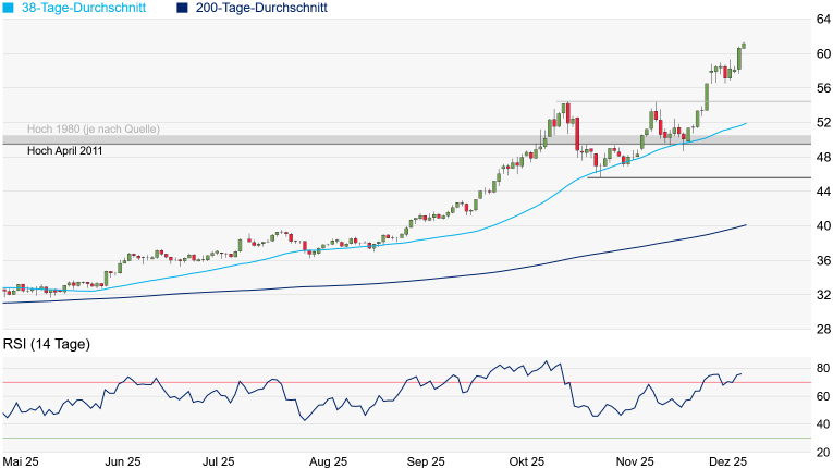 Quelle: Bloomberg. Bitte beachten Sie, dass aus der Wertentwicklung in der Vergangenheit nicht auf die zukünftige Wertentwicklung geschlossen werden kann. | | Charttechnik: Die Silberpreis-Rally hat sich gestern dynamisch fortgesetzt – erstmals in der Geschichte kletterte des Preis des Edelmetalls über die Marke von 60 US-Dollar. Wohin die Reise noch gehen kann, ist ungewiss. Der Silbermarkt dürfte 2025 das fünfte Jahr in Folge mit einem Defizit beenden. Und auch in den kommenden Jahren dürfte die Unterversorgung anhalten, was zu weiteren Engpässen und somit weiteren Preissteigerungen führen könnte. Kurzfristig liegt jedoch ein deutlich überkaufte